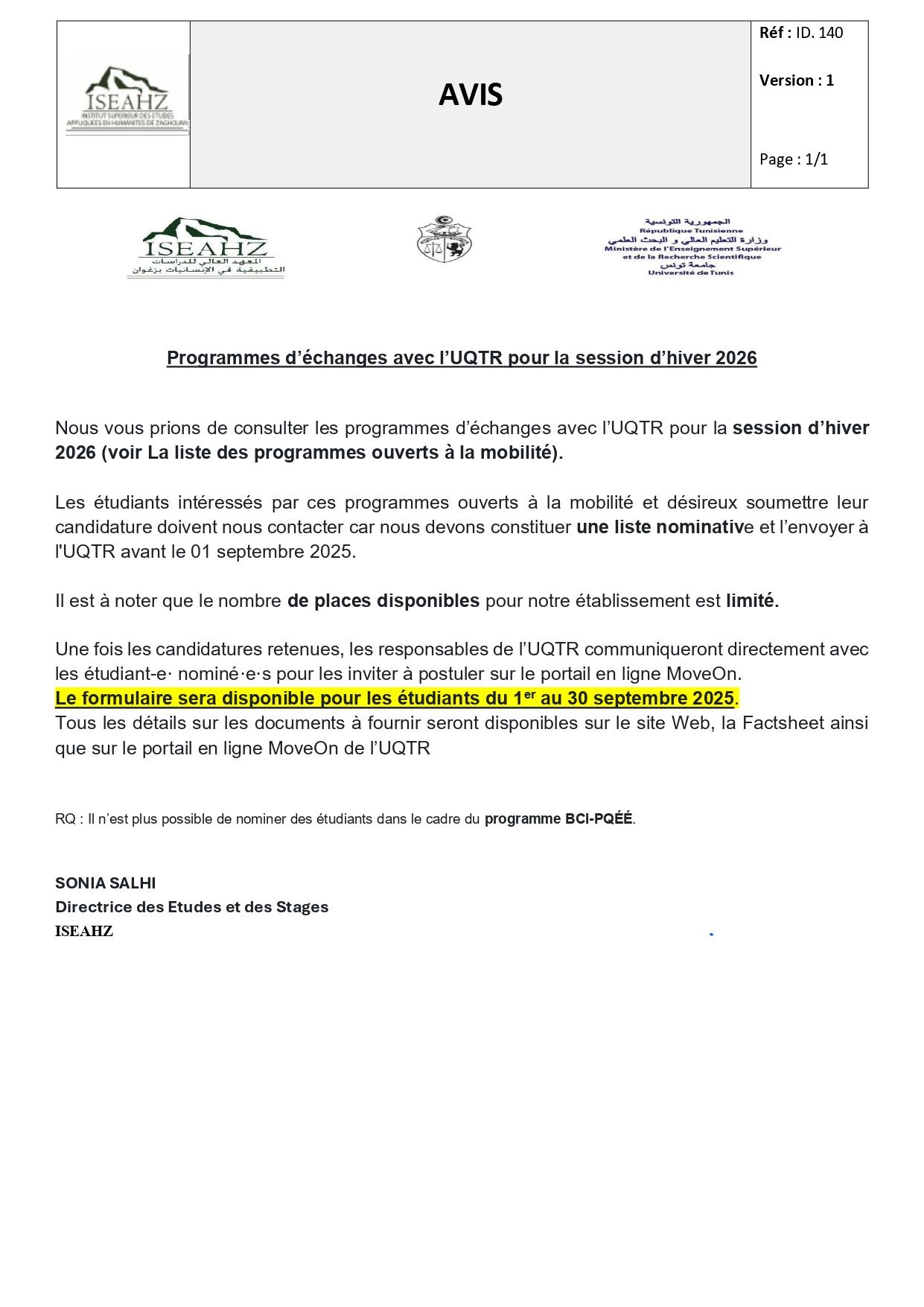 Contacter nous : 72660290 - Email : contact@iseahz.rnu.tn